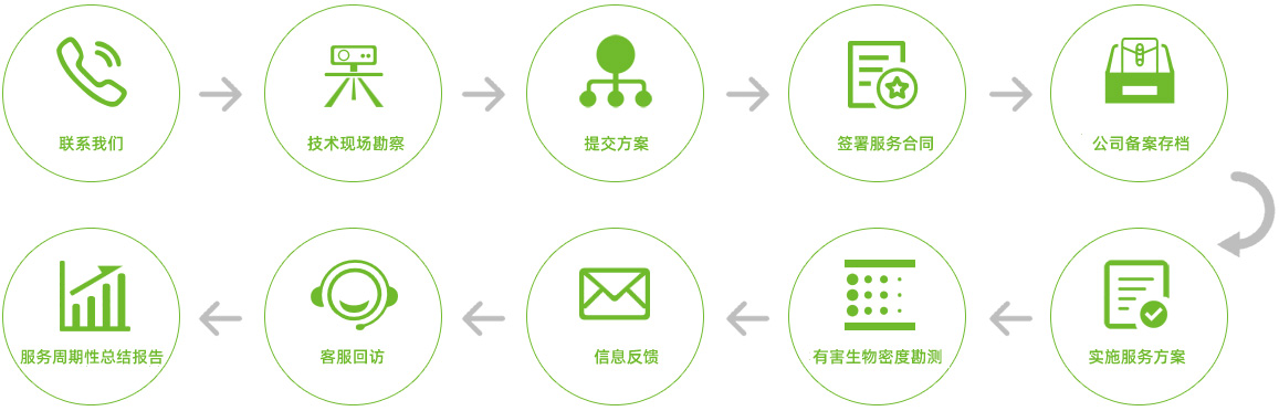 服務(wù)流程 煙臺(tái)海瑞達(dá)消毒殺蟲(chóng)技術(shù)服務(wù)有限公司為中國(guó)衛(wèi)生有害生物防制協(xié)會(huì)A級(jí)資質(zhì)服務(wù)單位